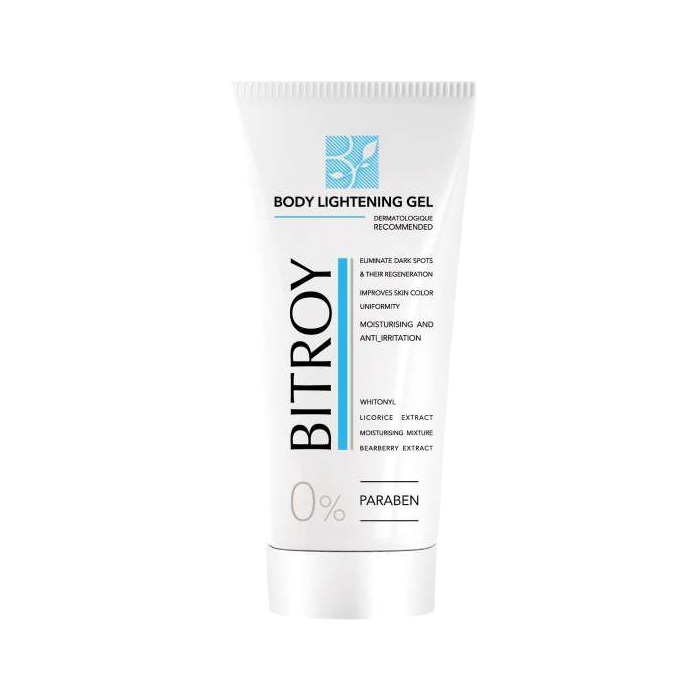 ژل روشن کننده بدن BITROY، بر پایه اکتیوهای موثر و عصارههای گیاهی تولید شده است، باعث از بین بردن نواحی تیره و لکهای پوستی میشود، با مهار آنزیم تیروزیناز و کاهش تولید ملانین در سلولهای پوستی به کاهش و روشن شدن لکها و نواحی تیره زیر بغل، آرنج، زانو و کشاله ران که در اثر سایش، فشار زیاد، آسیبهای محیطی، تغییرات هورمونی، افزایش سن و بارداری به وجود آمدهاند، کمک میکند، از ایجاد لکهای جدید و همچنین ایجاد چروک در پوست جلوگیری مینماید، باعث روشن و یکدست شدن رنگ پوست میشود، به پوست آبرسانی و رطوبت آن را حفظ میکند و مانع از ایجاد خشکی، التهاب و حساسیتهای پوستی میشود.