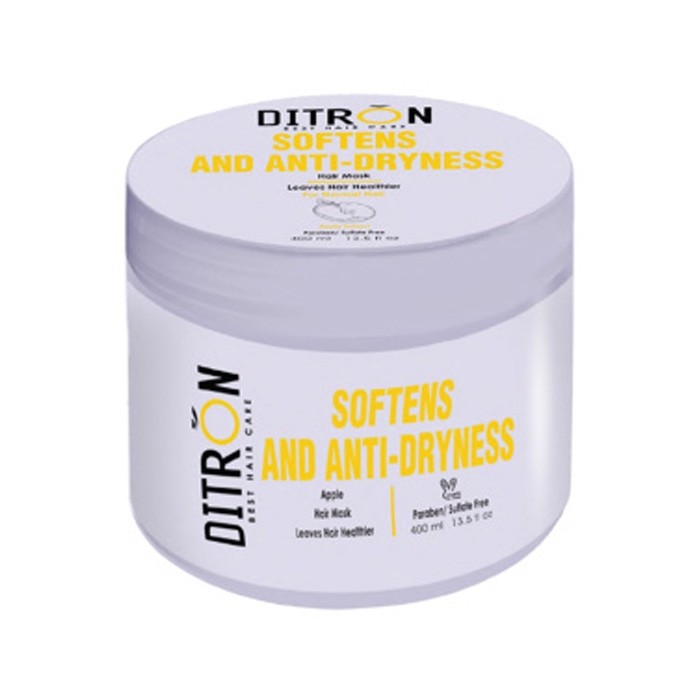 ماسک موی تغذیه کننده و نرم کننده سیب با آبکشی DITRON، ساقه موها را تغذیه و تقویت میکند، درخشش و حالت پذیری موها را افزایش میدهد، از خشکی موها، زبری و وز خوردگی جلوگیری میکند، الکتریسیته ساکن را از بین میبرد، به موها آبرسانی و از شکنندگی موها پیشگیری میکند.