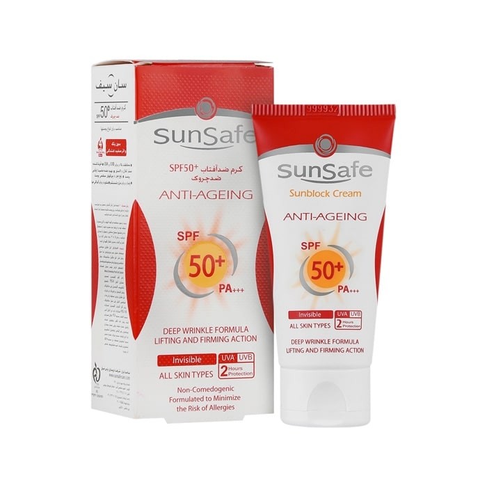 کرم ضد آفتاب و ضد چروک بی رنگ SunSafe SPF50، به مدت 2 ساعت در برابر اشعه UVA و UVB از پوست مراقبت میکند، باعث تحریک و افزایش سنتز کلاژن میشود، چین و چروک را کاهش میدهد و از ایجاد آن جلوگیری میکند، خاصیت سفت و لیفت کردن پوست دارد، سبب بازسازی سلولی و کاهش عمق چروکها میشود، خاصیت ارتجاعی پوست را بهبود میبخشد و ضد جوش و ضد رادیکالهای آزاد است. اگر به دنبال خرید ضد آفتاب با ویژگی ضد چروک هستید، کرم ضد آفتاب و ضد چروک SPF50 سان سیف را به شما پیشنهاد میکنیم.