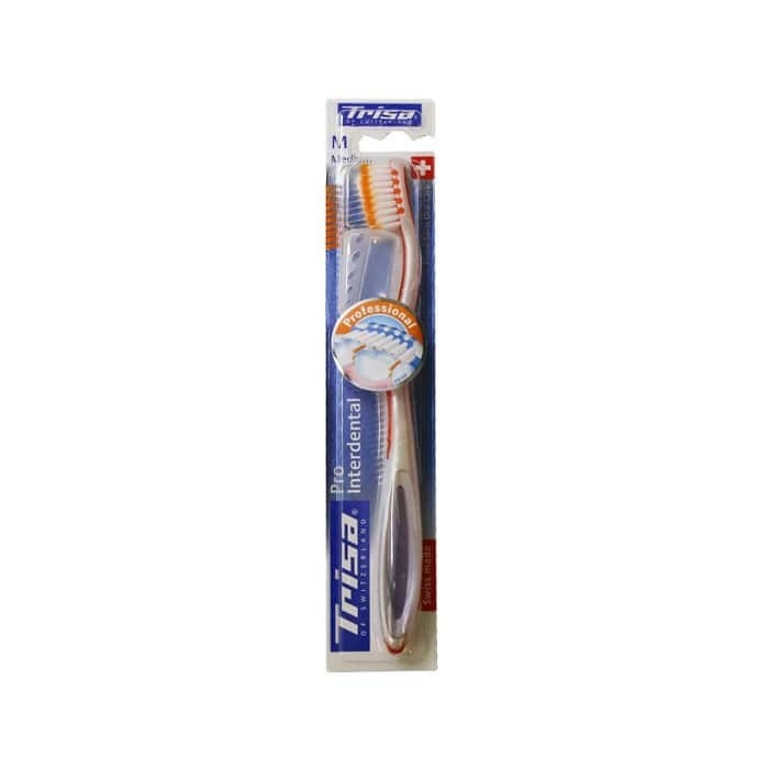 مسواک پرو اینتردنتال متوسط با محافظ Trisa، محصولی حرفهای با دسته ارگونومیک است، دارای الیاف بین دندانی بسیار نازک و نرم دو لایه است که میتواند به راحتی به فضای بین دندانها نفوذ و این نواحی را پاکسازی کند، مجهز به بالشتک پلاستیکی نرم در اطراف مسواک است که از لثه حین مسواک زدن محافظت میکند، سبب افزایش گردش خون لثه و محافظت از مینای دندان میشود، الیاف آن کاملا ته گرد بلند و کوتاه هستند و دارای زبان پاک کن جهت رفع پلاکهای روی زبان است.