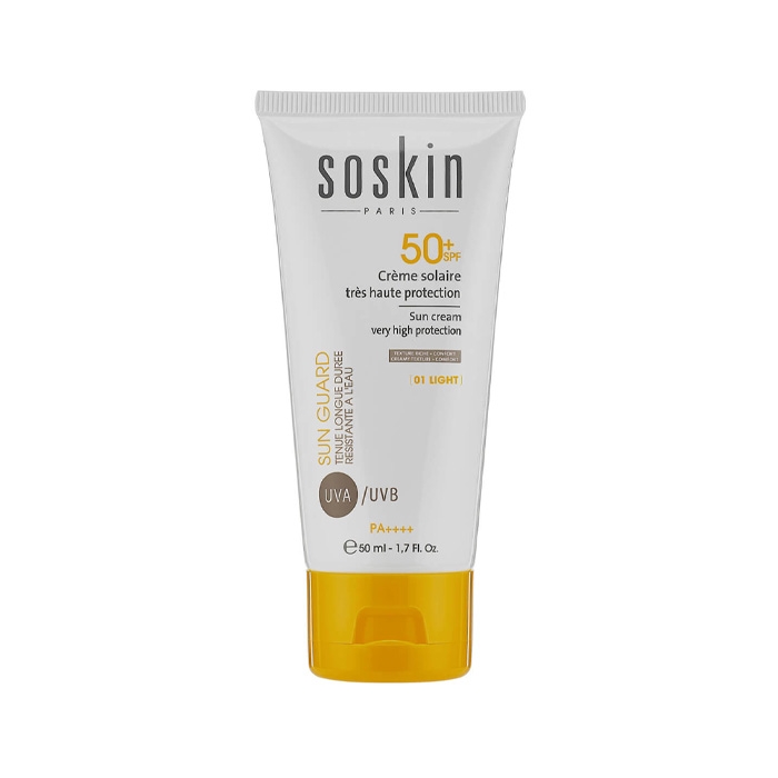 کرم ضد آفتاب رنگی با محافظت بسیار بالا SOSKIN SPF50، قدرت محافظتی بسیار بالایی دارد، مقاوم در برابر طیف گسترده نور UVA است، پوست را نرم و مرطوب نگه میدارد، از خشک شدن آن جلوگیری میکند، فاقد مواد مضر و حساسیتزا است، رد سفیدی به جا نمیگذارد. با خرید ضد آفتاب رنگی با محافظت بالای ساسکین از محصولی با شاخص ++++PA برخوردار میشوید که تا 98% از چروک ناشی از آفتاب جلوگیری میکند.