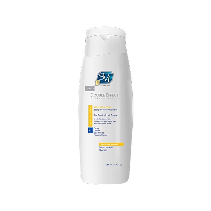 شامپو دو کاره ضد ریزش و ضد شوره SVI، باعث درمان ریزش مو و رفع شوره سر میشود، از رشد و تکثیر قارچ مولد شوره به نام مالاسزیا جلوگیری میکند، به بهبود گردش خون پوست کف سر و تغذیه رسانی و اکسیژن رسانی به فولیکولها کمک میکند، هورمون دی هیدروتستوسترون را مهار و از ریزش تارهای مو جلوگیری میکند، از خاصیت آنتی اکسیدانی برخوردار است، رشد موها و ضخامت آنها را بهبود میبخشد، التهاب و تحریکات پوست سر را تسکین میدهد و از تارهای مو در برابر عوامل مخرب محیطی به ویژه رادیکالهای آزاد محافظت میکند.