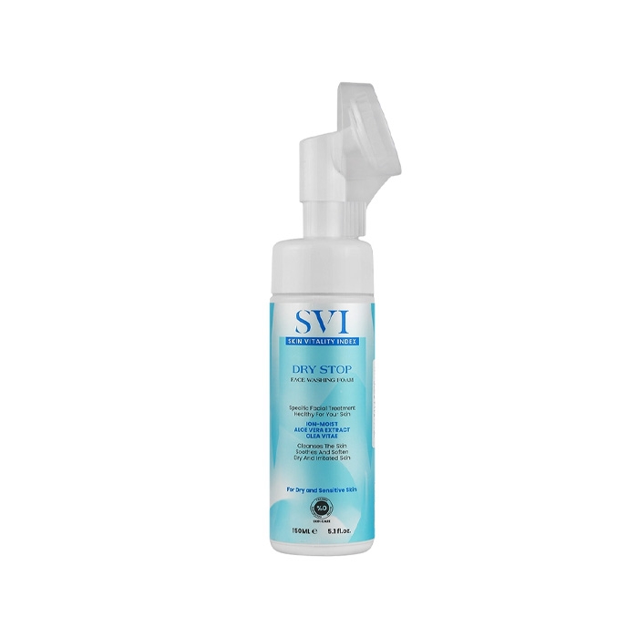 فوم شستشوی صورت درای استاپ SVI، باعث پاکسازی چربی، آلودگی و مواد آرایشی میشود، پوست را نرم و شاداب میکند، حاوی ترکیبات جاذب رطوبت محیط است، باعث حفظ رطوبت پوست و جلوگیری از خشکی و کشیدگی میشود و از تحریکات پوستی جلوگیری میکند. براش این محصول مثل یک لایه بردار فیزیکی ملایم عمل میکند و سبب پاکسازی بهتر پوست و منافذ آن میشود.