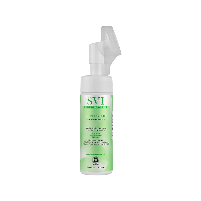 فوم شستشوی صورت سبو استاپ SVI، باعث پاکسازی چربی،آلودگی و مواد آرایشی میشود، پوست را نرم و شاداب میکند، باعث حفظ رطوبت پوست و جلوگیری از خشکی و کشیدگی میشود، میزان چربی پوست را تنظیم میکند، باعث جلوگیری از بروز جوش و آکنه میشود و از تحریکات پوستی جلوگیری میکند. براش این محصول مثل یک لایه بردار فیزیکی ملایم عمل میکند و سبب پاکسازی بهتر پوست و منافذ آن میشود.