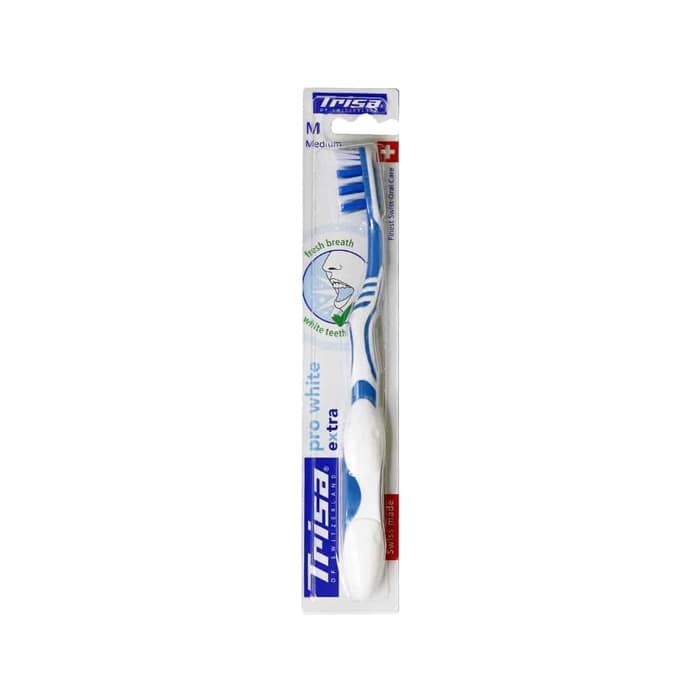 مسواک اکسترا پرو وایت متوسط Trisa، دارای سه ردیف الیاف حاوی مرواریدهای کوچک آبیرنگ است که مؤثرترین ماده در سفید کردن دندانهایی است که بر اثر دخانیات یا قهوه و چای تغییر رنگ دادهاند. الیاف این مسواک به صورت ضربدری با فواصل بسیار ظریف کنار هم قرار داده شدهاند، به تمام نقاط دندانها و لثه دسترسی دارند، سطوح و فواصل بین دندانها را به خوبی پاکسازی و سفید میکنند، الیاف بلندتر جلوی مسواک باعث پاک کردن باکتریها و میکروبهایی میشوند که مسبب بوی نامطبوع دهان هستند و دسته آن ارگونومیک و از مواد ضد لغزش پوشیده شده است.