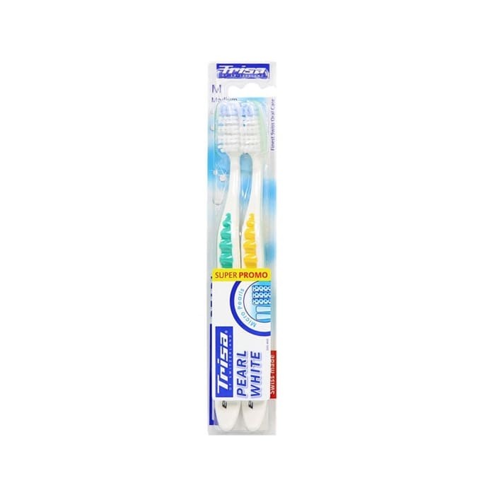 مسواک پرل وایت متوسط دو عددی Trisa، منطبق با آناتومی طبیعی دندان است، الیاف آن دارای مرواریدهای آبی رنگ حاوی سیلیکا است که در زمان مسواک زدن این گویهای گرد آبی رنگ در آب دهان حل میشوند و موجب سفید شدن و جلوگیری از زرد شدن دندانها میشوند و همچنین به عنوان شاخصی برای مدت زمان مصرف مسواک کاربرد دارند. دسته این مسواک با طراحی ارگونومیک با ساختار موجی شکل از لیز خوردن آن جلوگیری میکند، الیاف آن ارتفاعهای متفاوتی دارند، علاوه بر تمیز کردن سطوح دندانها، به فضاهای بین دندانی هم نفوذ و این مناطق را کاملا پاکسازی میکند و این الیاف کاملا ته گرد هستند و به مینای دندان آسیبی نمیزنند.